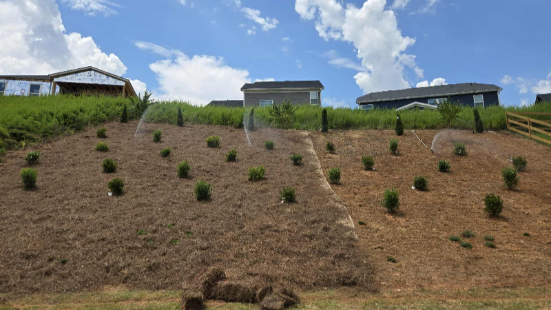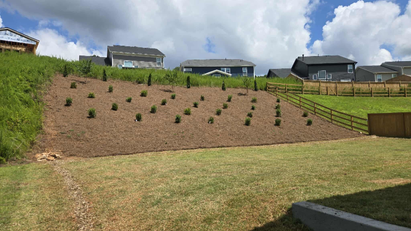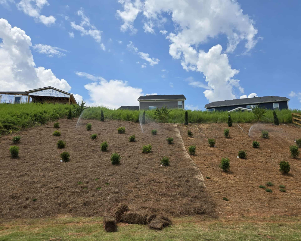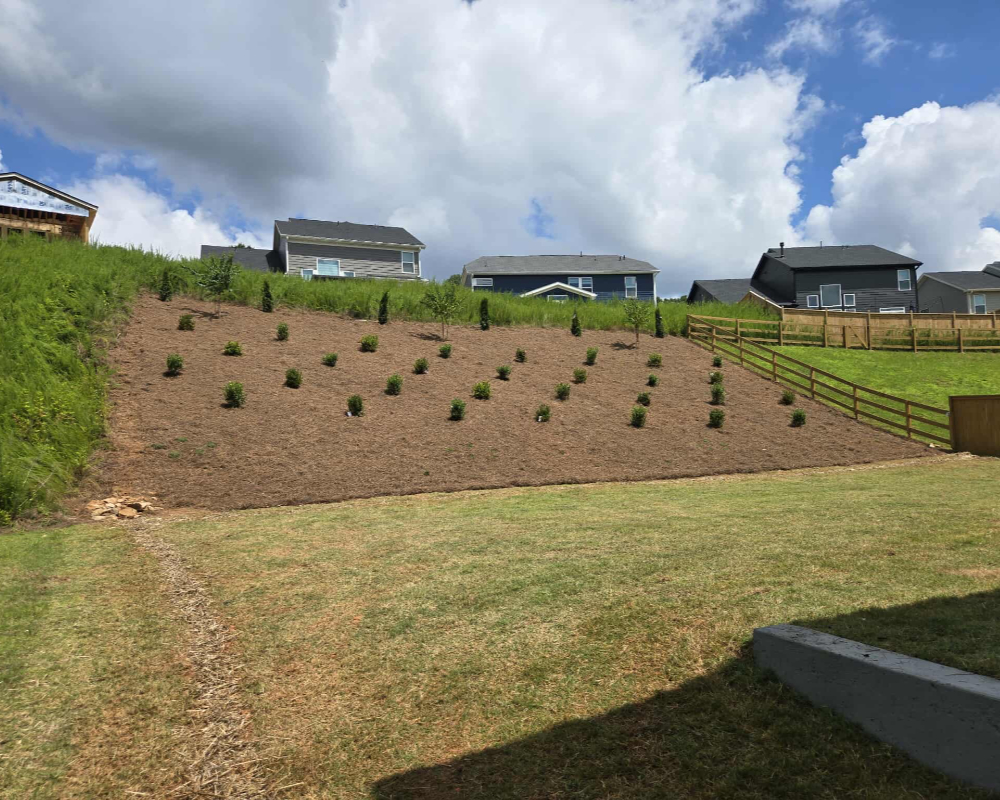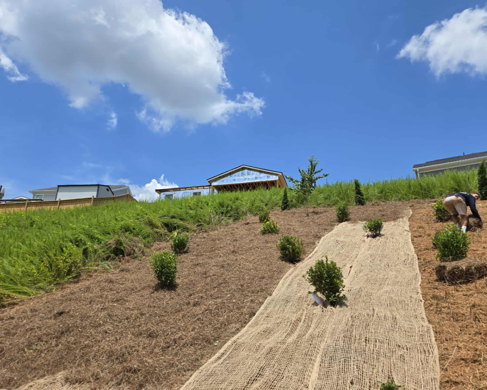 Once the overgrowth was removed, it became clear how much soil movement had occurred on the slope. We cut back the vegetation with a brush cutter and applied a 12-month herbicide treatment to prevent regrowth. After preparing the hillside, we installed jute erosion control mesh to secure the soil while the new plantings establish their root systems. A mix of flowering shrubs was added for beauty and stability, and a new irrigation system was installed to ensure consistent moisture and long-term plant health. The project was finished with a clean layer of pine straw for a polished look.