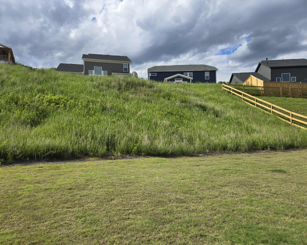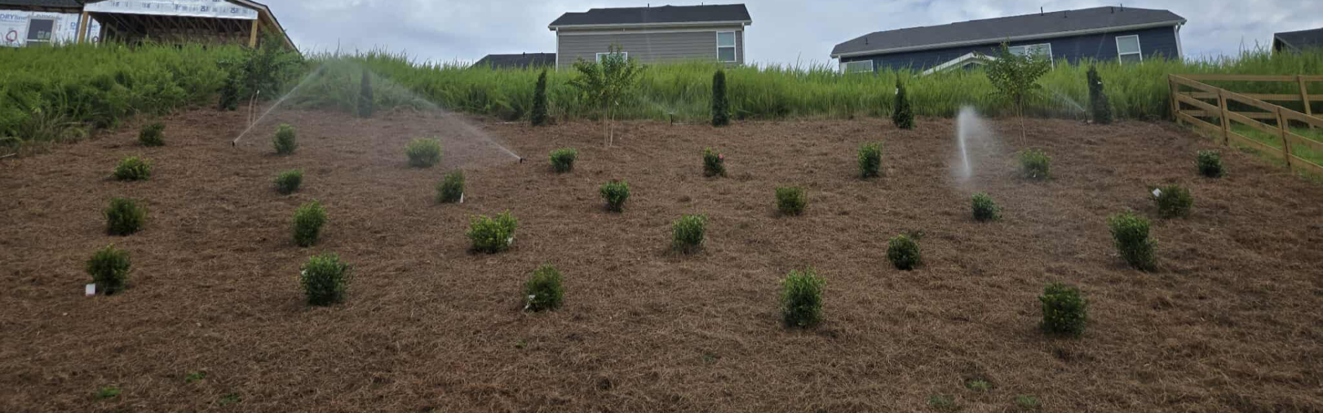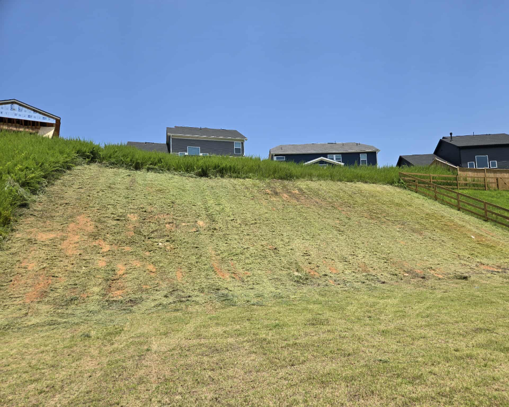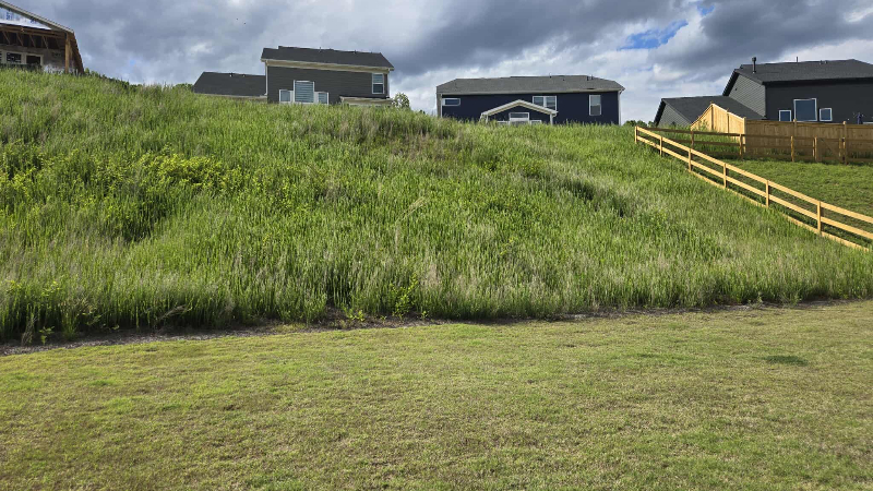 Once the overgrowth was removed, it became clear how much soil movement had occurred on the slope. We cut back the vegetation with a brush cutter and applied a 12-month herbicide treatment to prevent regrowth. After preparing the hillside, we installed jute erosion control mesh to secure the soil while the new plantings establish their root systems. A mix of flowering shrubs was added for beauty and stability, and a new irrigation system was installed to ensure consistent moisture and long-term plant health. The project was finished with a clean layer of pine straw for a polished look.