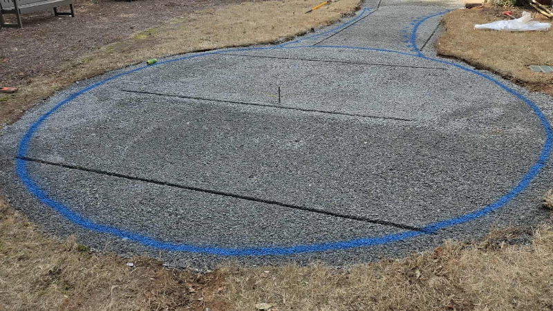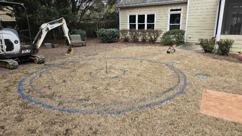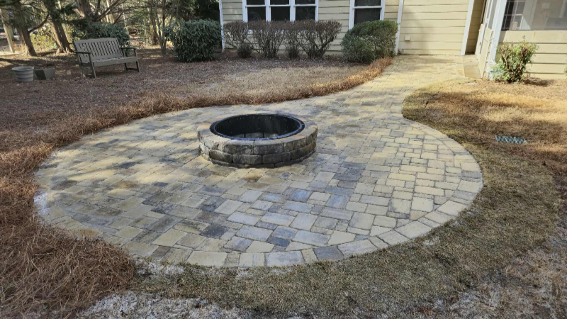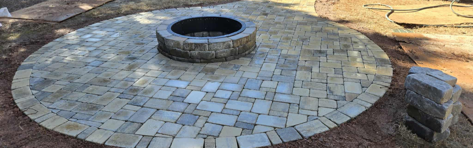 The planned firepit location had a negative slope, which would have caused water to pool on the patio if left uncorrected. We performed slight regrading to adjust drainage and ensure proper water runoff away from the firepit area. After excavation, we installed a solid 6" base to support the patio and laid Belgard Dublin Cobble pavers for a classic, textured look. Polymeric sand was used in the joints to lock the pavers in place and prevent shifting. Once construction was complete, all disturbed areas were resodded to leave the yard looking clean and finished.